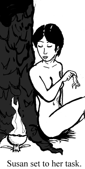 and shattered grinning skulls. Susan lead the way through the forest - coyly